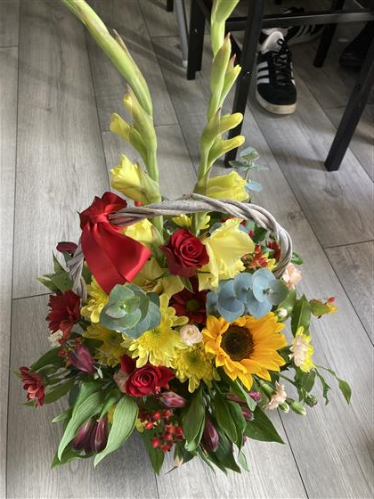 Choose from a range of colour options and we will create a traditional basket arrangement using seasonal blooms and foliage.