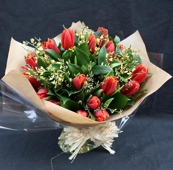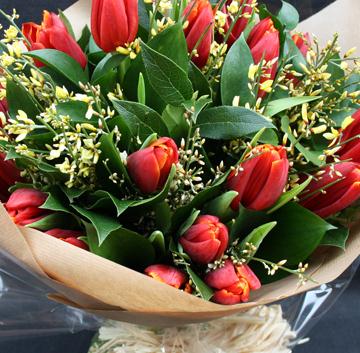 This elegant bouquet features rich red tulips accented with delicate seasonal foliage, hand-tied and wrapped in natural kraft paper for a warm, sophisticated finish. It’s a classic choice that never goes out of style — bold in color, graceful in form.