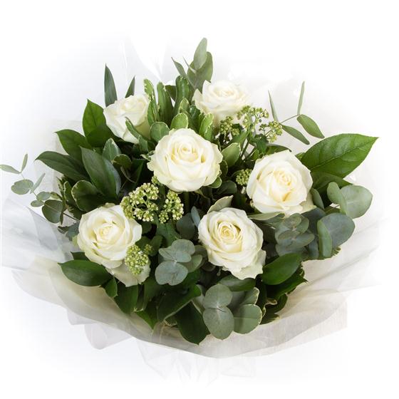 This beautiful bouquet of six white roses is a timeless symbol of sincerity, peace, and new beginnings. Carefully hand-tied with fresh greenery and wrapped in crisp white paper, it’s a simple yet meaningful gift that never goes out of style.
