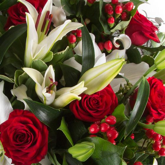 Make a statement of love and elegance with our Red Rose & White Lily Hand-Tied Bouquet, a stunning blend of passionate red roses and pure white lilies, accented with lush green foliage for a naturally sophisticated look.