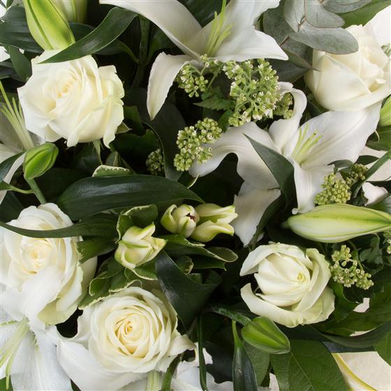 A fragrant hand-tied bouquet of oriental lilies and white roses mixed with eucalyptus.